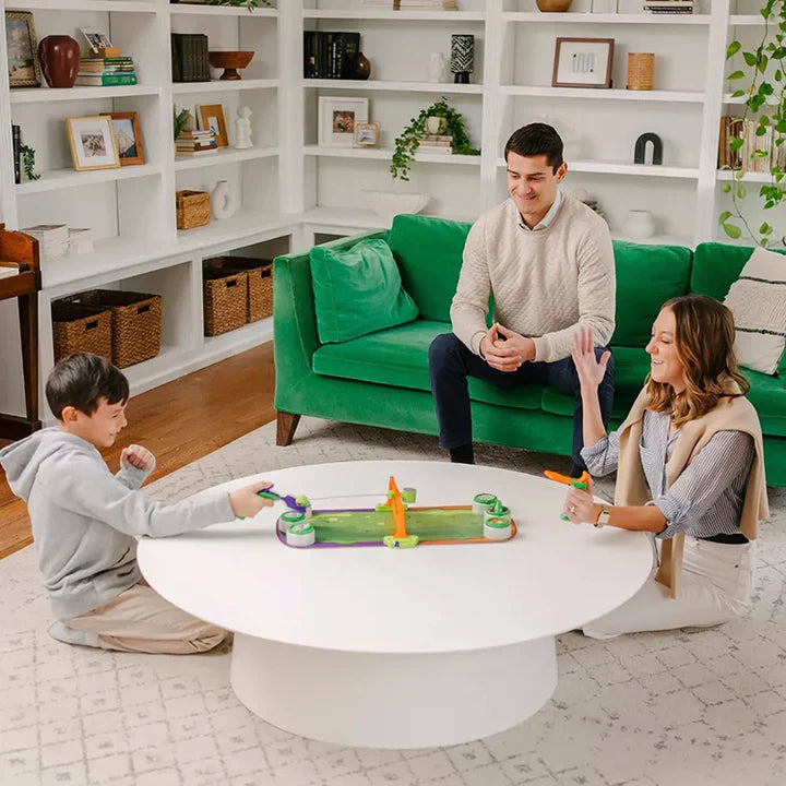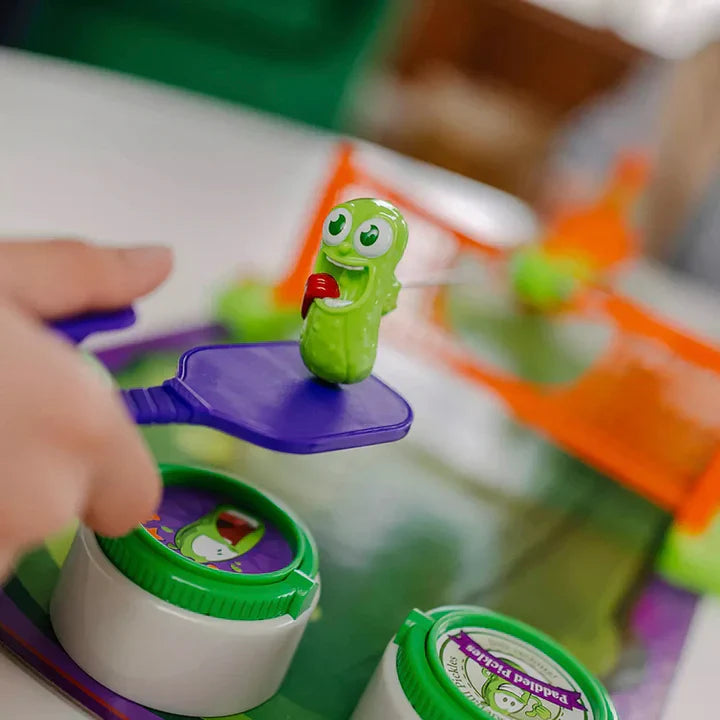 Bring the excitement of the hottest paddle sport to your home with Pickleball Blast - The Pickle Smackdown Game! Perfect for kids aged 6 and up, this game is all about fast-paced, fun-filled action. Your little ones will love smashing the wiggly Pickle with their Pickleball Paddle in thrilling face-to-face battles. The goal is to aim for the opponent’s Pickle Jars, but beware—the tricky Pickle Skewer can send the Pickle flying back their way! The first player to flip over two of the three Pickle Lids scores. Pickleball Blast is easy for young kids to set up on any table and includes everything you need: the Board/Court, 2 button-controlled Paddles, 1 Net, 1 Pickle, and 6 Pickle Jars. Boys and girls can keep track of their score on the Score Slider on the side of the Pickle Board, with the first to score 4 points winning the game. "Relish the moment" with this action-packed game that promises endless fun and laughs for your children!
