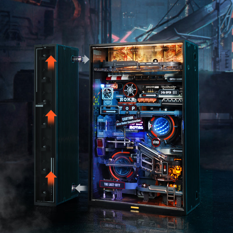 A cyberpunk-inspired DIY miniature model building kit with a fully automated marble lift. Connect via type-C, tap to start, and enjoy two modes: marble running or lighting display.